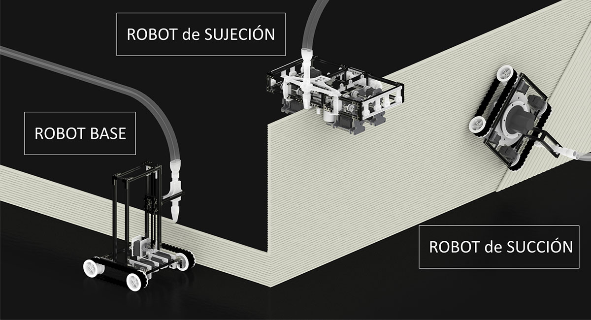 Tal y como describen en su web – http://iaac.net/printingrobots/# – uno o varios robots base realizan las primeras 20 capas de la estructura. Los robots pueden moverse a lo largo de una trayectoria predefinida tanto en un sentido como en el contrario de forma continua. Estos pequeños robots están conectados mediante tubos al robot central que suministra el material de impresión. Finalizada esta base, otros robots se encargan de realizar tareas de sujeción construyendo el resto de la estructura, el desplazamiento de sus boquillas permite que puedan imprimir superficies curvas. La velocidad de curado del material de impresión es lo suficientemente rápido para emplearlos en la impresión horizontal. Estos robots pueden entre otras cosas imprimir techos, dinteles de ventanas y de puertas Para reforzar la estructura, un robot de succión recorre la estructura añadiendo las capas adicionales de refuerzo allí donde sea necesario. Estos robots pueden desplazarse sobre superficies con cualquier inclinación.